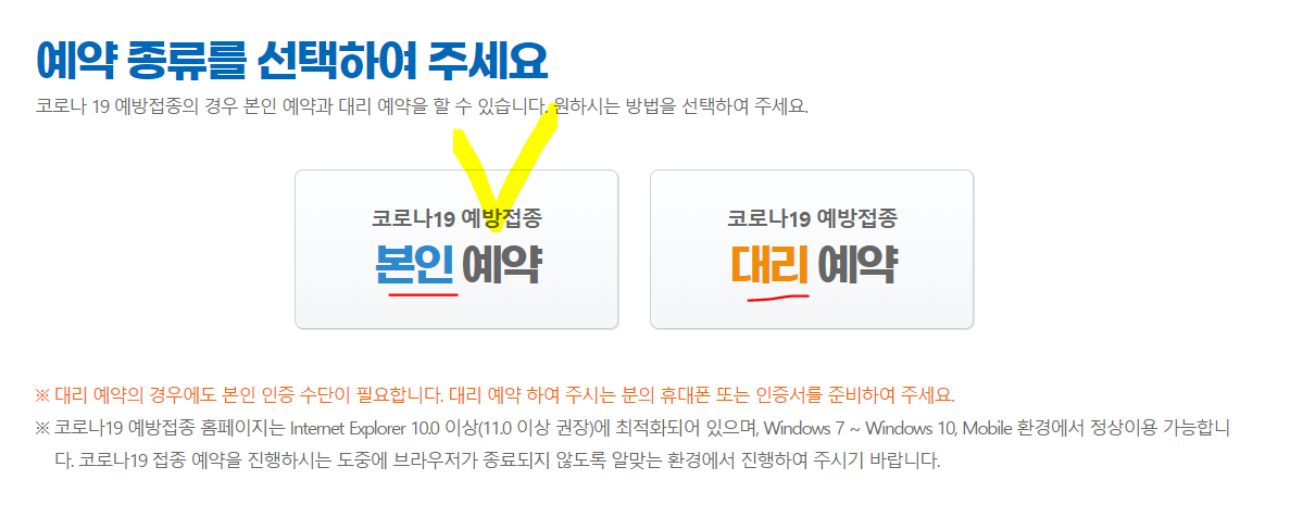 본인이 하시는 경우들이많은데, 본인예약을 눌러주셔도 되고, 아니면 가족이나 친척분들께서 대신 해주시는 경우 대리예약을눌러주시면됩니다.