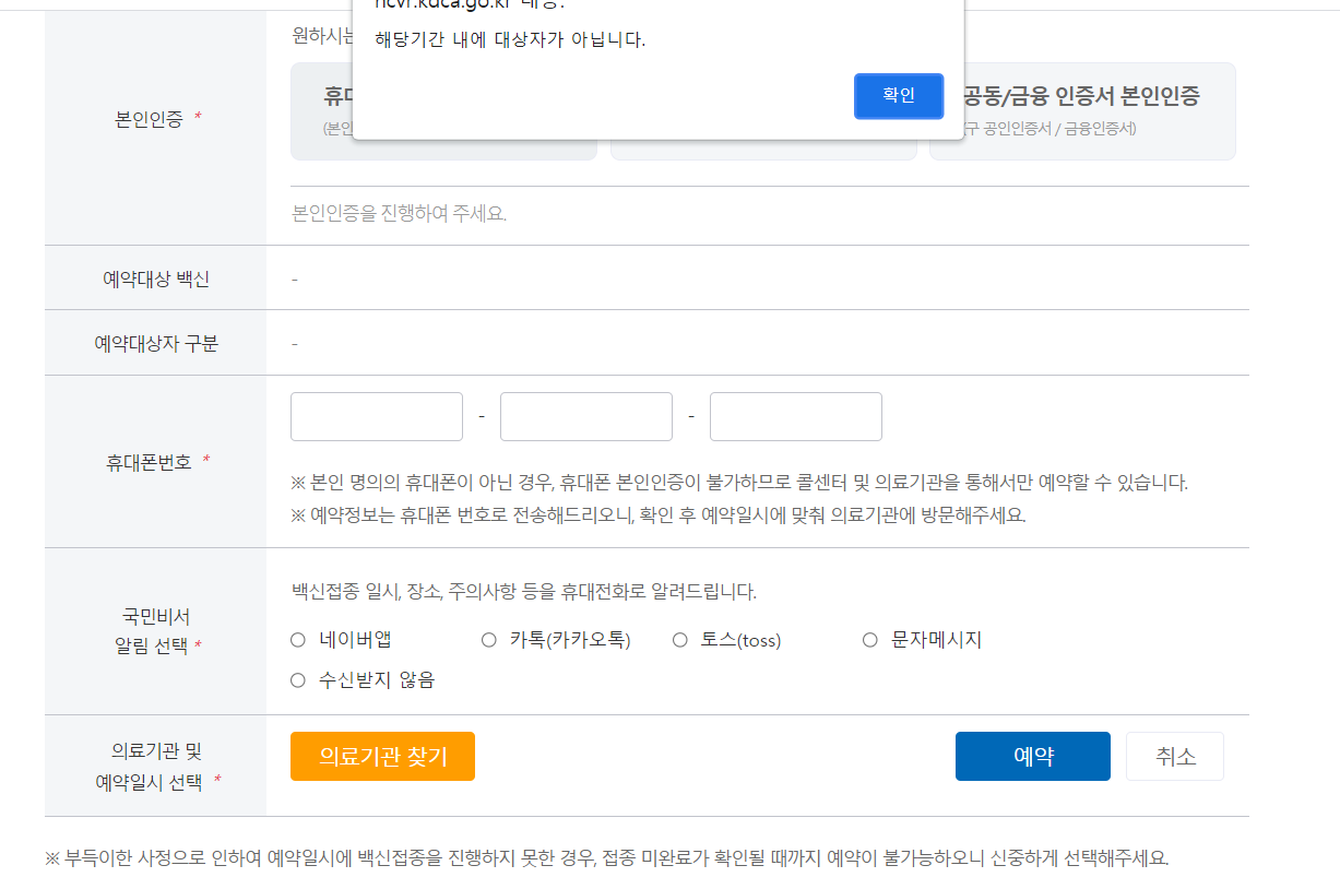 그다음 위에 말씀드렸던 해당 기간내에 대상자시라면 정상적인 진행이 되지만 저는 일단 현재로서는 대상자가 아니기때문에 아래와 같이 나옵니다."해당기간 내에 대상자가 아닙니다." 하지만, 위에 말씀드렸던 글을 읽으시고 해당되시는 사항이 맞다면, 해당되는 일자에 해당 연령대시라면 가능할것입니다.