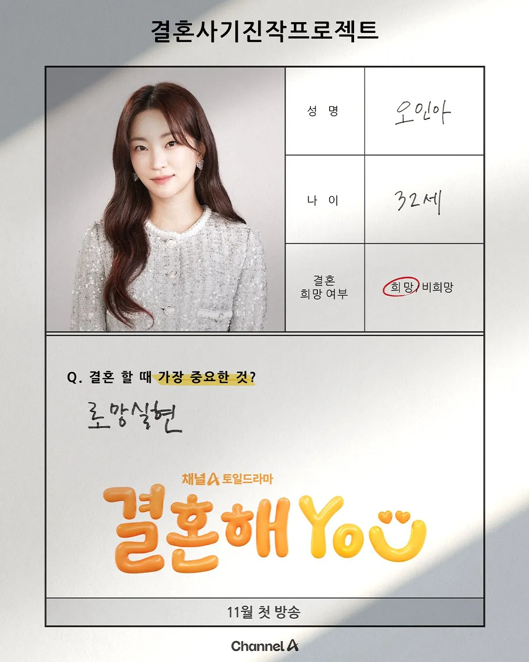 11월 16일 저녁, 채널A의 새로운 주말 드라마 '결혼해YOU'가 시청자들을 찾아옵니다.