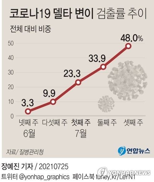 이러한 수치를 본다면 상당히 엄청난 속도로 델타변이가 퍼지고 있는 것을 알 수 있습니다. 델타변이가 대부분 처음에는 해외 유입사례검출률이 거의 95% 에 가까울정도로 높은 수치를 보였으나, 현재는 조금씩 전파가 되어 우리나라 내부에서도 30% 정도 나오는 상황입니다.