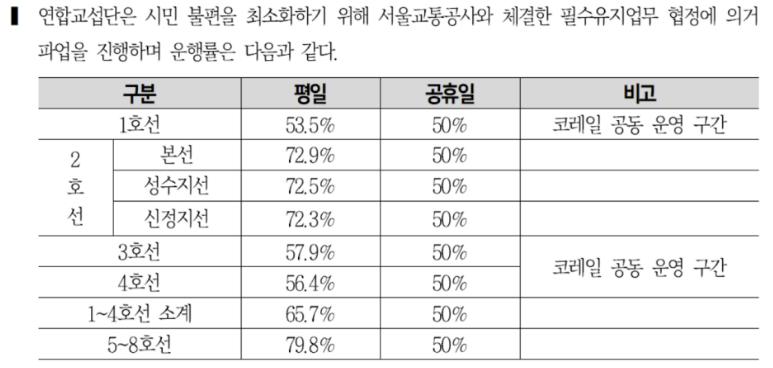 현재 노조는 본격적인 파업에 앞서 준법투쟁을 전개하고 있습니다. 준법투쟁이란 열차 정차 시간을 엄격히 준수하는 방식으로, 정시 운행을 지키기 위해 추가적인 대기 시간이 발생하게 됩니다.