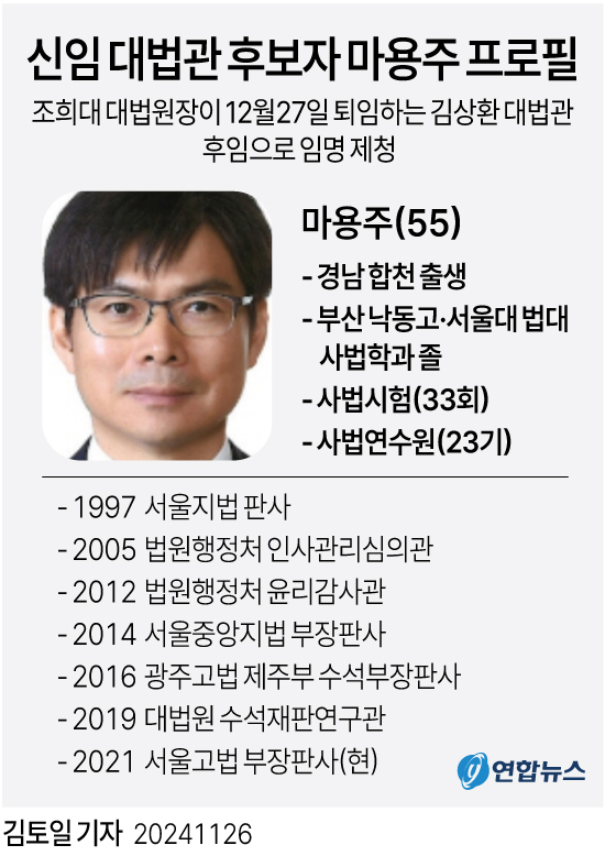 2024년 11월 26일, 조희대 대법원장이 김상환 대법관의 후임으로 마용주 서울고등법원 부장판사를 임명 제청했습니다.