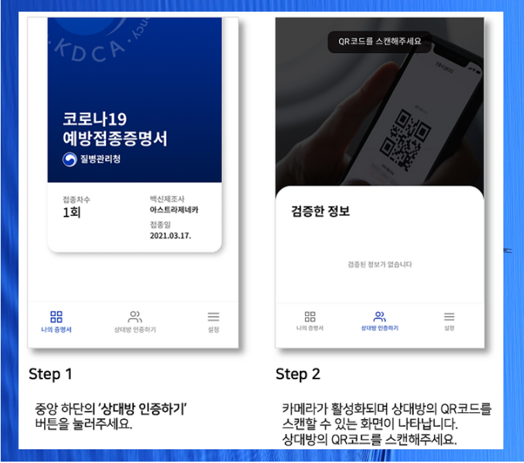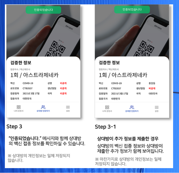 QR코드를 스캔하면 인증되었습니다라는 문구와 함께 상대방의 백신접종 정보를 확인하실 수 있습니다.