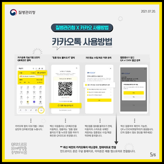 보통 전자 증명서는 COOV앱을 이용하여서 증명을 하시거나, 따로 어플리케이션을 설치하는것이 귀찮으시거나 불편하다면 카카오톡이나 네이버 등의 어플을 사용하는 방법도 있습니다. 개인적으로는 가장추천드리는 방법입니다. 카카오톡은 다들 사용하시니 카카오톡으로 백신증명서를 발급하고 사용하는 것이 가장 간단하고 번거롭지 않은 방법인것 같습니다.