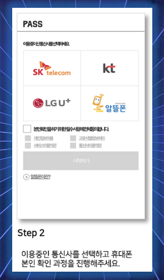 본인인증 버튼 눌러주시고 - 이용중이신 통신사를 선택하시고, 본인인증 과정을 진행해주시면 됩니다. 여기서는 간편인증시스템(PASS)같은 것들을 통해서 빠르게 하실 수 있습니다. 그리고, 발급받기 버튼을 눌러주시면 발급 끝!