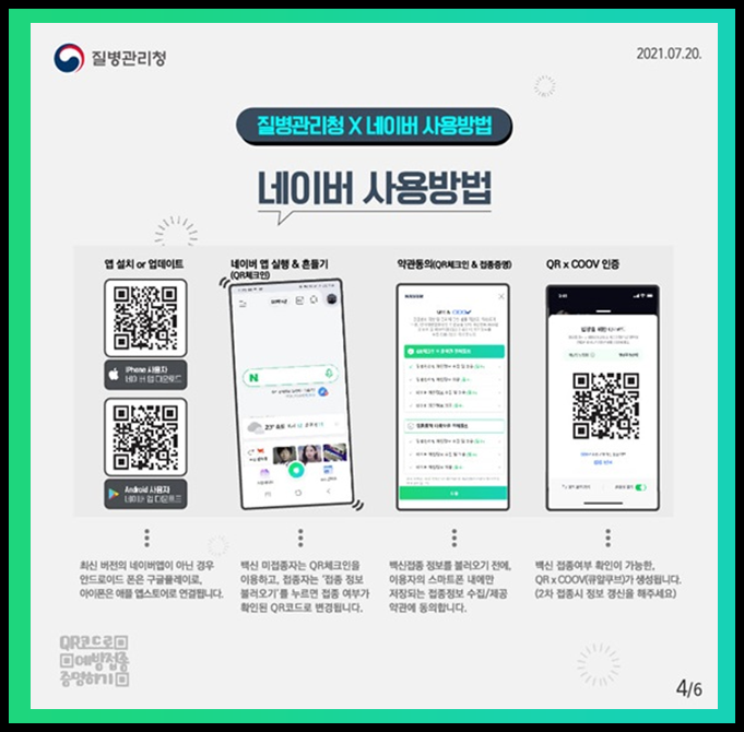 아래 사진과 같이 네이버는 네이버 앱을 받으시거나, 있으신 분들께서는 앱을 여신다음, 네이버앱에서 QR체크인을 하는 곳에 접종증명을 할 수 있는 '접종 정보 불러오기'를 클릭하시면, 정보수집제공동의만 하면 바로 QR코드를 찍는 페이지에 같이 백신 접종 증명서도 같이 발급받으실 수 있습니다.