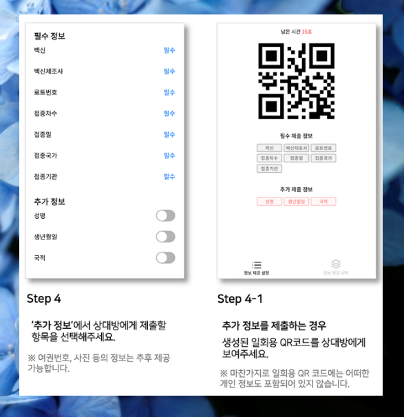 그리고 추가정보를 제출하는 경우 생성된 다음과 같은 QR를 보여주시면 됩니다. QR코드에는 백신을 접종했다는 정보외에, 개인정보는 일체 포함되어있지않습니다.