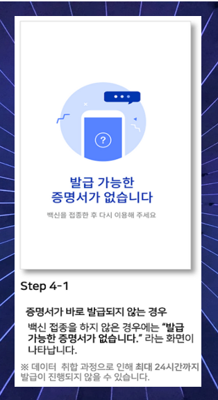 이렇게 위에 사진처럼 질병관리청데이터를 기반으로 하여 증명서가 발급됩니다. 그리고 혹시나, 백신 증명서가 즉시 발급되지는 않는 경우는 이렇게 오른쪽 사진처럼 "발급가능한 증명서가 없습니다"라고 나옵니다.