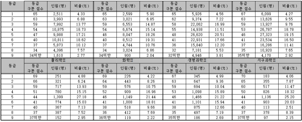 - 생명과학 I: 1등급 45점, 2등급 42점, 3등급 37점