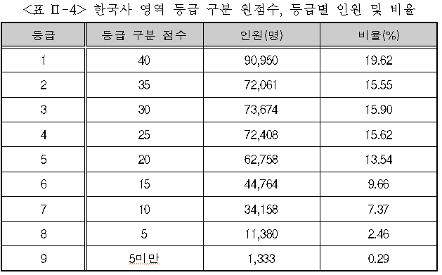 - 한국사: 1등급 40점, 2등급 35점, 3등급 30점