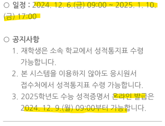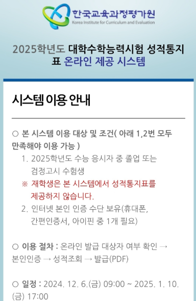 온라인 발급은 12월 6일 금요일 오전 6시부터 가능하며, 성적 증명서는 12월 9일부터 추가 발급됩니다. 단, 온라인 발급은 졸업생 및 검정고시 수험생만 가능하며, 재학생은 해당되지 않습니다. 따라서 재학생은 반드시 학교를 통해 성적표를 수령해야 합니다.