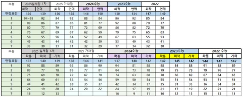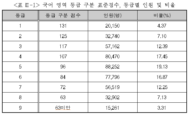 - 국어: 1등급 131점, 2등급 125점, 3등급 117점
