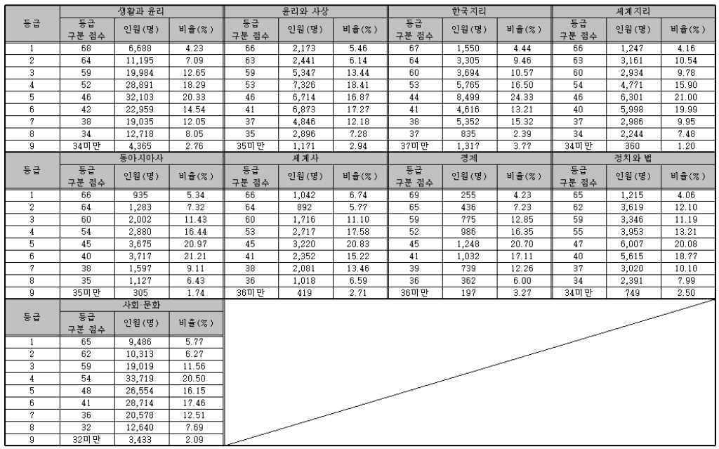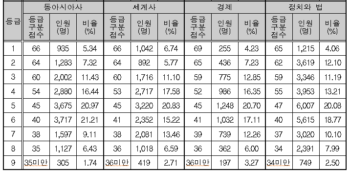 - 정치와 법: 1등급 48점, 2등급 44점, 3등급 40점