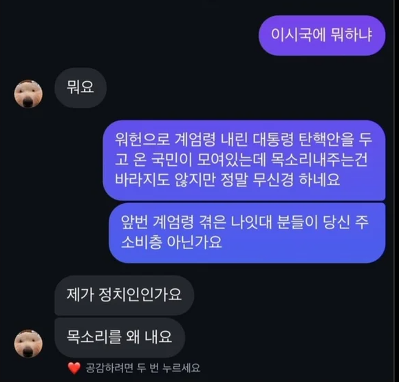 이에 대해 임영웅은 "뭐요?"라는 짧은 답변을 보냈습니다. 이후 네티즌은 "당신 주 소비층인 중장년층이 이번 계엄 사태를 겪어본 세대다. 정치적 입장을 드러내라는 게 아니라 최소한 공감이라도 보여야 하는 게 아니냐"고 추가 비판을 이어갔습니다. 이에 임영웅은 "제가 정치인인가요? 목소리를 왜 내야 하죠?"라는 반문으로 대답했는데요. 이 발언이 공개되자 SNS와 커뮤니티에서는 다양한 의견이 분출되며 논란이 증폭되었습니다.
