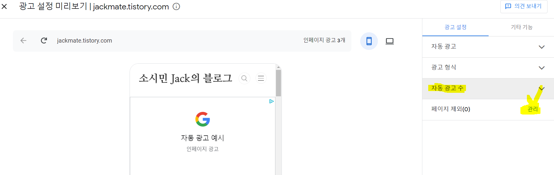 물론 이 행동이 나쁜것은 아닙니다. 잘못된 것도 아니고, 저는 제가 광고를 넣고 싶지 않은 글에 아무리 조회수가 많이 나더라도 그 글에는 광고를 빼고 싶었습니다. 하지만 광고를 빼고 넣고 그리고 무엇보다 자동광고수가 너무 많이 설정되어있는 것 같아서 자동광고수에 대한 수정을 상당히 많이 했던 것으로 기억합니다.