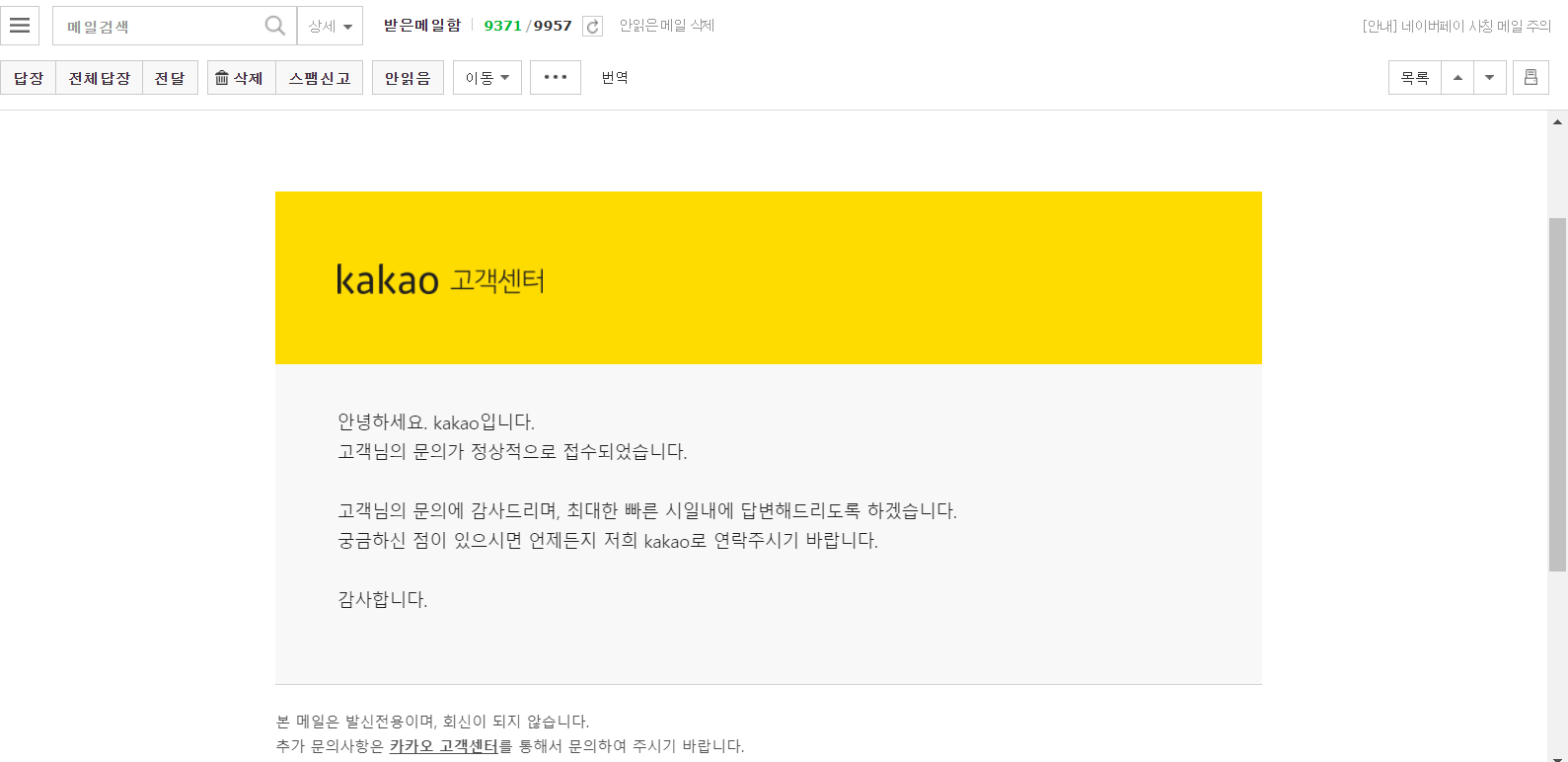 이렇게 위와 같이 문의 글을 접수하시면, 등록한 이메일에 이렇게 확인하였다는 메일이 오게 됩니다. 기다렸더니 벌써 온간가 싶었지만 역시 지연됩니다.
