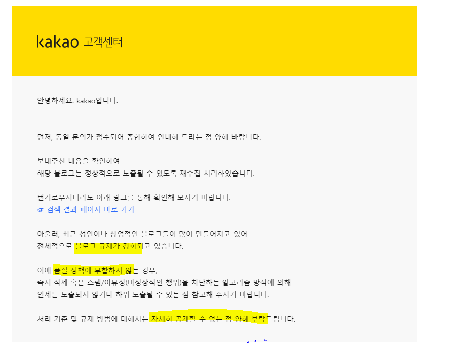 저품질 판단을 당했다면, 일단 이 늪에서 벗어나야 합니다. 정말 잘못한 경우가 아니라면 충분히 근거를 들어서 벗어날 수 있으므로 안심하셔도 됩니다. 일단 카카오 고객센터에 접속하여 이의제기를 하시면 됩니다. 그리고 이의제기는 빨리 하실 수록 더욱 블로그에도, 정신건강에도 좋습니다.