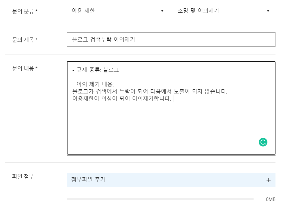 저는 이런식으로 적고, 이용제한 - 소명 및 이의제기 순으로 고르고, 제목과 내용을 이런식으로 구성하였습니다.
