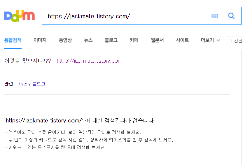 저품질이라고 쓰고 다음 검색 누락이라고 읽습니다. 즉, 구글이나 네이버등의 사이트에서는 접속이 가능할수있어도, 다음과 카카오에서는 접속이 안되는 케이스이기 때문입니다. 누락이 된 경우는 다음에서 주소를 검색하면 없다고 나옵니다.