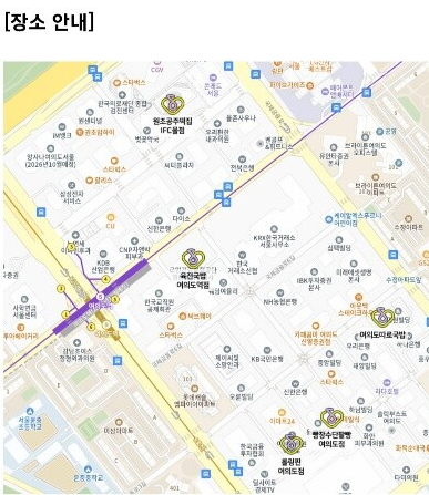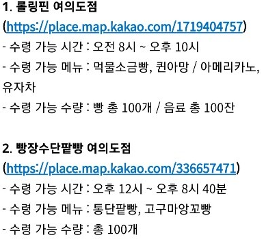 아이유의 선결제 지원은 여의도에 위치한 5곳의 매장에서 이뤄집니다. 각 매장의 위치와 수령 가능 시간은 다음과 같습니다: