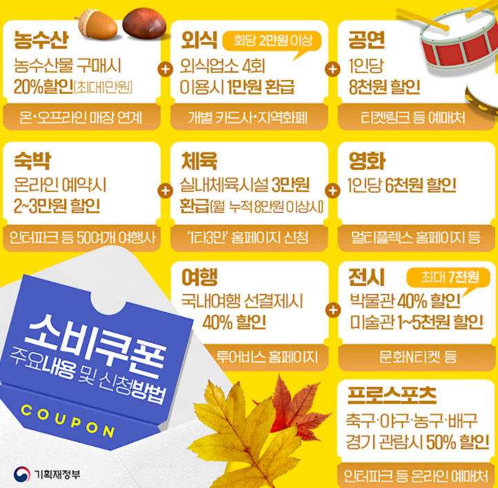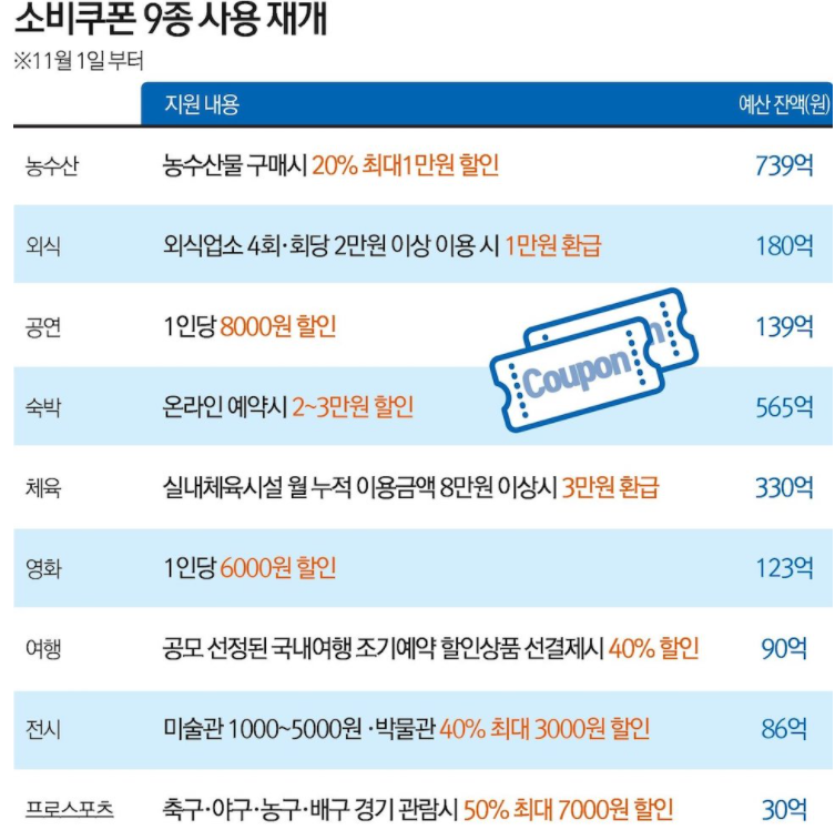 또한 이뿐만 아니라, 헬스장 등에 대한 쿠폰, 관광산업, 그리고 교통 분야(기차, 버스 등)에 대한 쿠폰도 진행될 예정이라고 하니, 주의깊게 보시면 돈을 아끼고 소비하는데도 버는것같은 효과를 누리실 수 있을 겁니다.