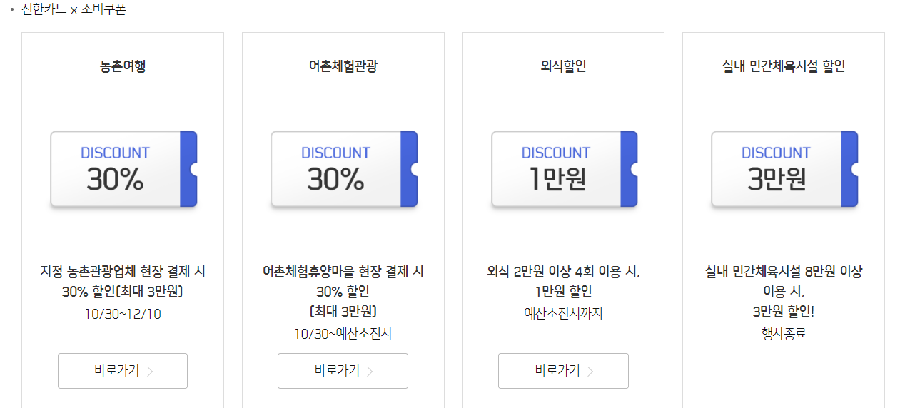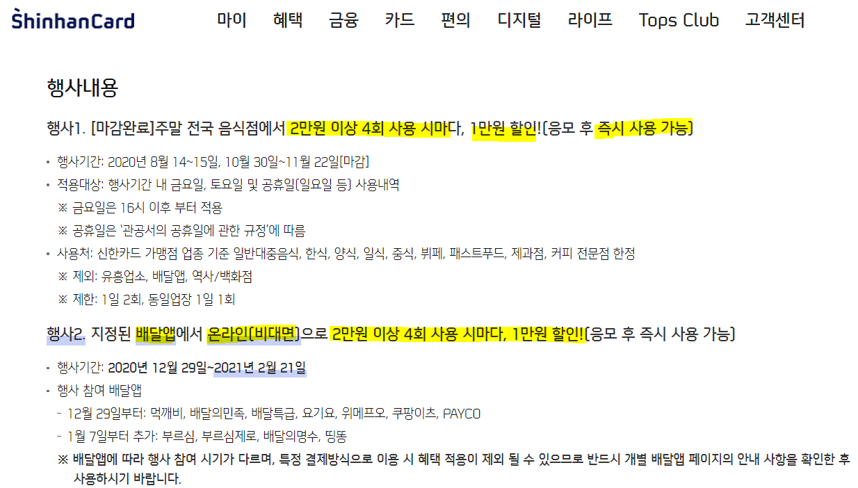11월 전에 접속하시면 종료되어있는 것으로 나올 수 있습니다. 위에서와 같이, 저는 신한카드를 자수사용하는데, 이처럼 카드사에 접속하게 되시면, 쿠폰과 관련된 사항을 확인하고 신청하는 부분이 있을 수 있습니다. 저는 왼쪽사진에서 외식할인에 대한 바로가기를 눌러봤습니다. 그랬더니 아래와 같이 안내가 되어있습니다. 배달 앱과 같은 경우는 2만원 이상 4회시 사용시마다 1만원할인 식입니다. (신한카드 홍보가 아닌데 제 주거래은행이 신한이다보니 어쩌다가 이렇게 됐군요. 아무 카드사이든지 정부지원 할인쿠폰 사업을 하는 카드사는 포함이 됩니다. 본인의 주거래은행을 먼저 확인하시면 좋을 것 같습니다.)