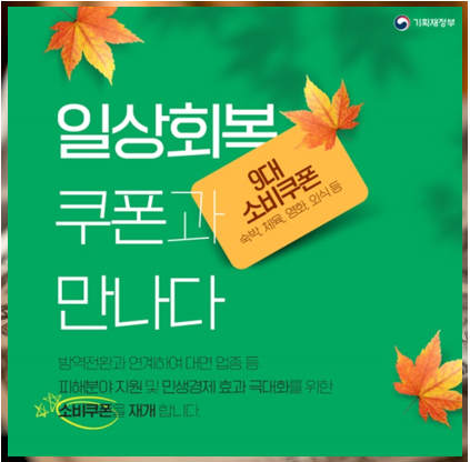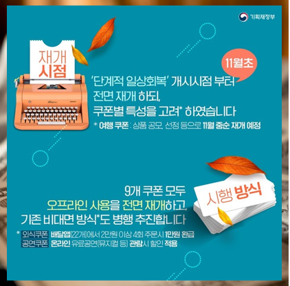 위에 쿠폰들 외에도 11월부터 위드코로나 상황으로 더욱 확대될 것으로 예정되는 정부 지원 소비 쿠폰은 상당히 다양하고 폭넓은 혜택으로 소비를 높이는데 도움이 될것으로 예상됩니다.(소비자입장에서는 상당한 이득일 수 밖에 없습니다. 다만, 선착순이면 억울하니까(?) 빨리 알아두고, 먼저 쿠폰을 사용하고 혜택누리는게 제일 이득이겠죠?)