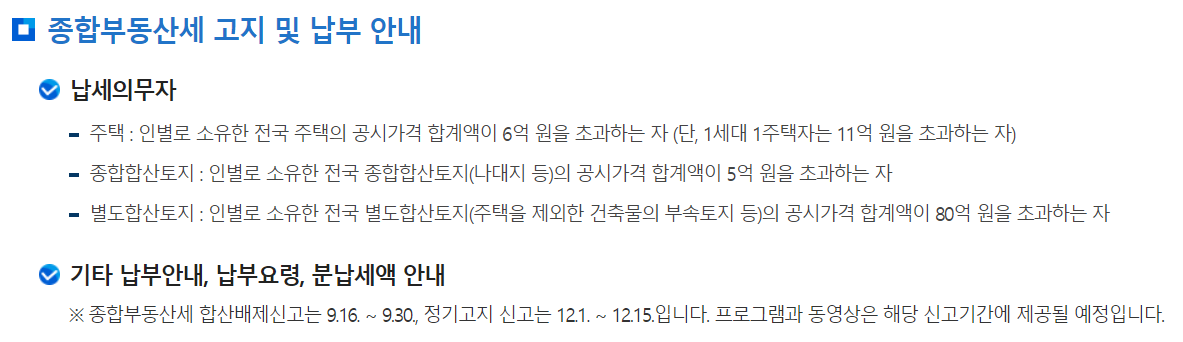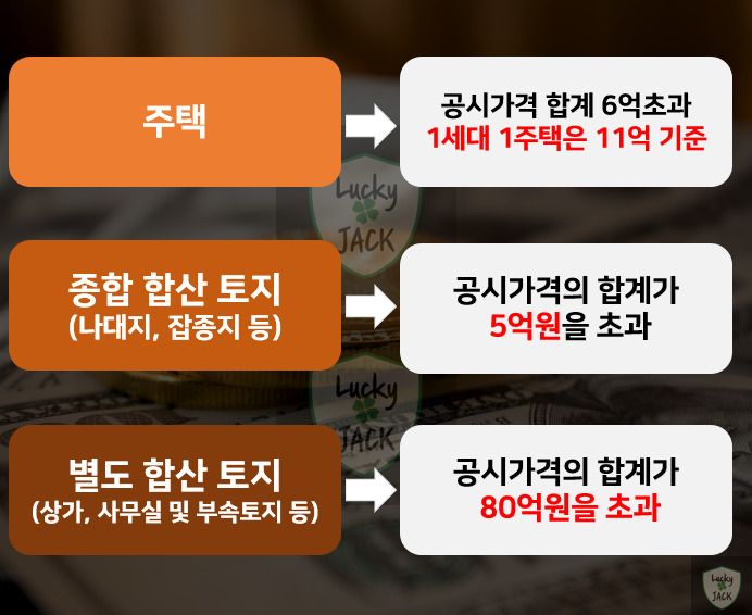 1) 주택 : 소유한 주택의 공시가격 합계가 6억원을 초과하는 경우 단, 1세대 1주택만 있는 경우는 11억원 초과가 기준