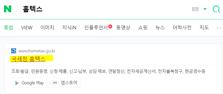 먼저 이렇게 네이버나 포털사이트에 홈텍스 혹은 국세청 등을 검색하여 들어갑니다.