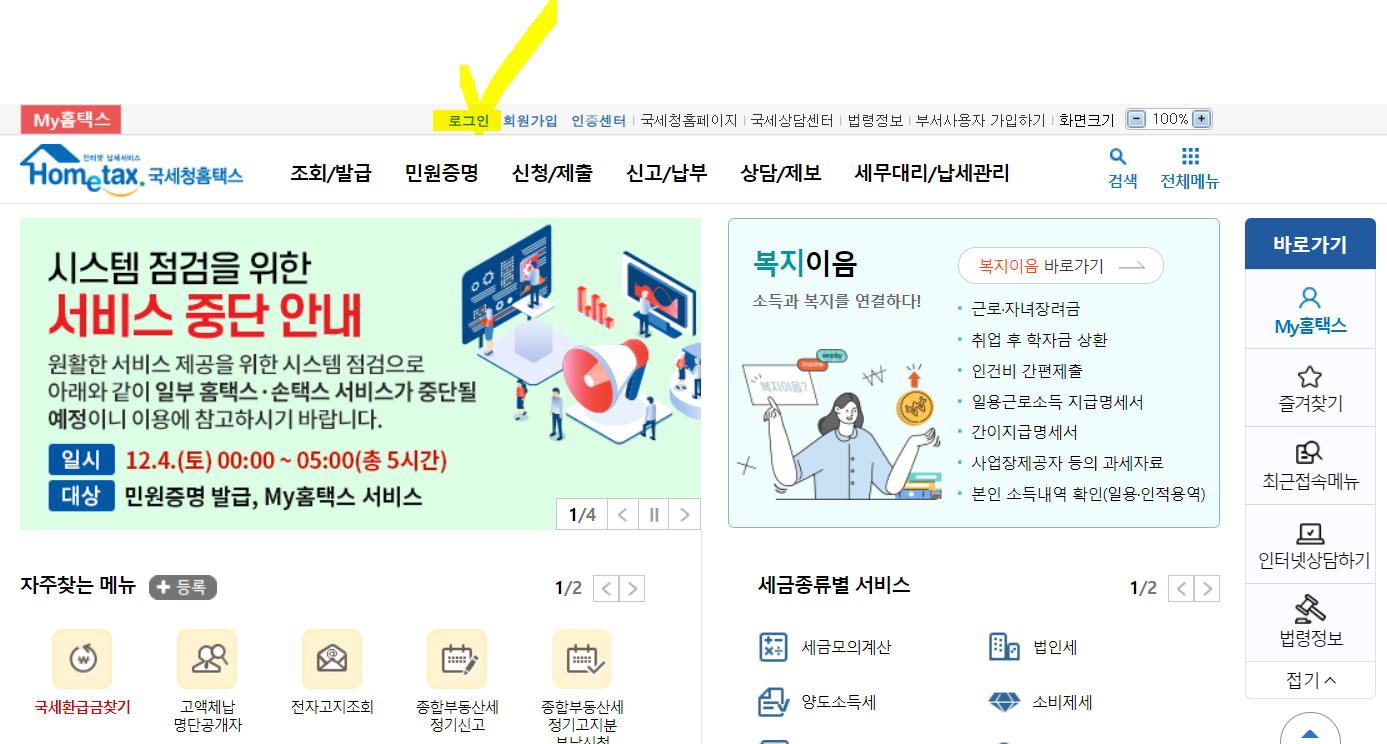 그다음 이렇게 홈텍스 화면이 나오면 로그인을 찾습니다.