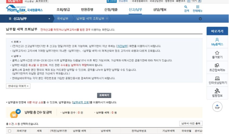 그리고 신고/납부에 화살표를 대고, 세금납부의 국세납부를 클릭하고, 납부할 세액 조회납부를 클릭하시면 아래와 같은 화면이 나옵니다.