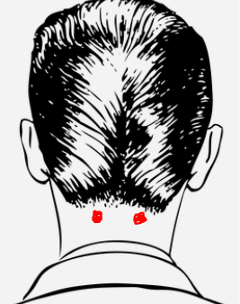 먼저 풍지혈은 목 뒤쪽에 중앙을 기점으로 양쪽 1~1.5cm가량 떨어져있는 오목하게 파여있는 양쪽혈입니다.