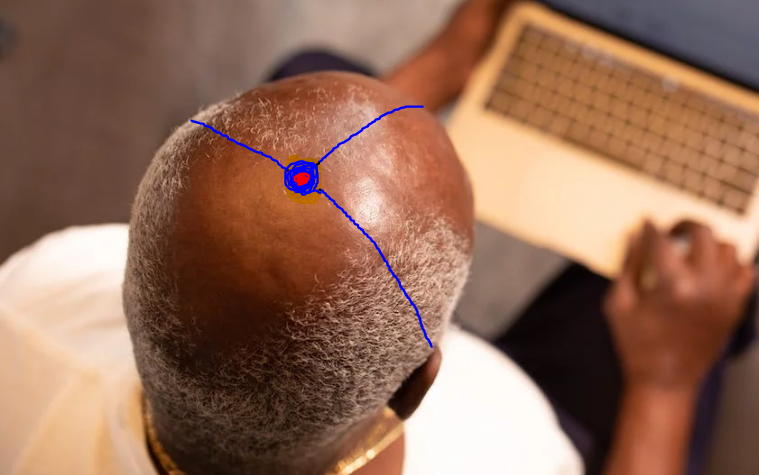다음 백회혈은 머리 위쪽 정수리 근처에 있습니다. 한마디로 머리꼭대기라고 생각하시면 되는데요. 백회혈은 양쪽귀쪽을 기준으로 수직으로 머리를따라 올라가는 부분. 그리고 미간 쪽에서부터도 중심으로 수직으로 올라간 선이 만나는 지점입니다. 머리의 중앙이자 끝 부분에 위치합니다. 아래 사진에 그림으로 그려서 첨부합니다.