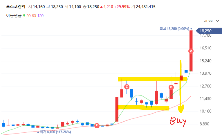 심지어는 주봉으로도 전고돌파하고 쉬었다가 가는 이상적인 자리였는데, 못본 것이 안타깝습니다. 저는 후반부에 조금만 담아서 10%만 수익보고 매도했는데, 포스코엠텍이 더 갈만한 자리였던걸 이제야 확인했네요.