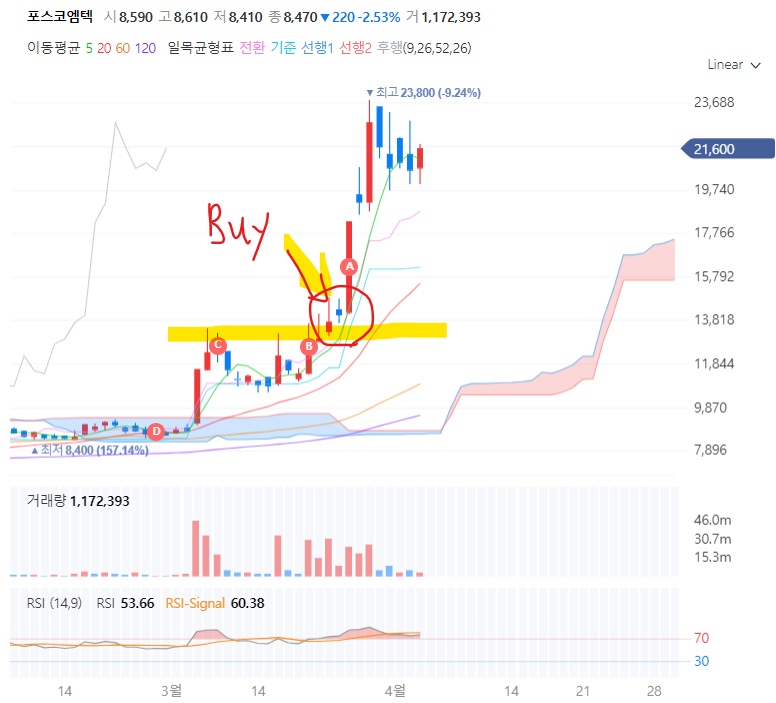 왼쪽에 포스코 엠텍은 저 BUY 지점에서 매수후 홀딩중이며, 갭상승 다음날 18%정도 더오르고 반매도 후 아직 보유하며 관망중이다. 안전하게 가고싶은 분들은 다른 계열사 주식 보다는 포스코홀딩스도 괜찮다.