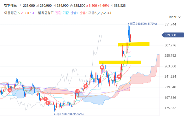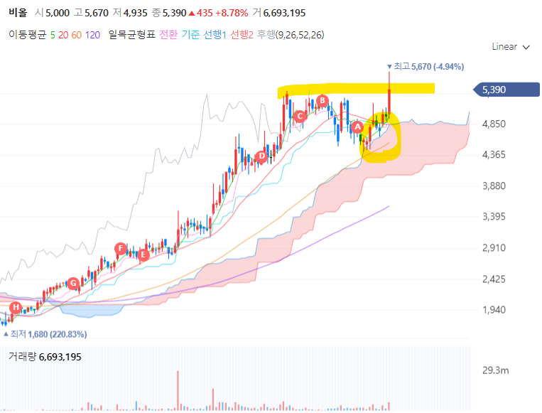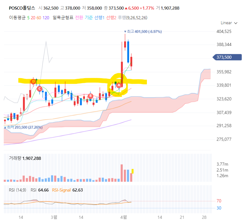 노란선에 지지저항으로 매물대가 크게 형성되어있을 것으로 보이며, 일목구름대 튕기고 상승수렴하는 모습을 보인다면, 관심종목에 담을예정