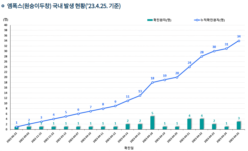한국도 엠폭스에서 완전히 안전한 나라는 아닌 것을 확인 할 수 있으며, 지금은 34명~40명 사이의 환자수로 추정되고 있습니다. 가장 최신 엠폭스 환자수를 확인하시려면 아래 정부 공식 질병관리청 홈페이지 링크에서 확인하실 수 있습니다.