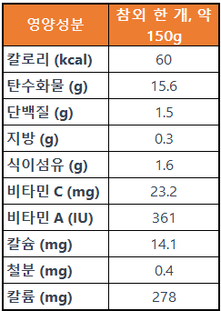 참외의 크기에 따라서, 그리고 숙성된 정도와 종류에 따라서 조금씩 달라질 수는 있지만 일반적으로 참외 한개에 150g이라고 가정했을때 칼로리 표와 영양성분을 정리해보았습니다.