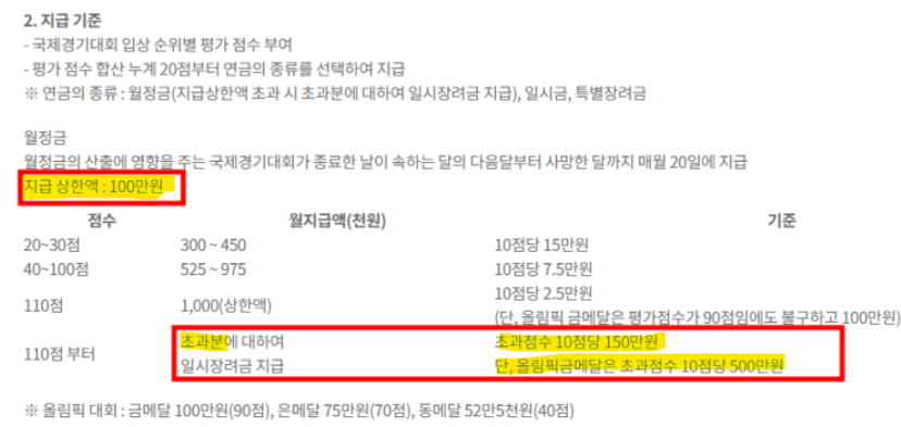 그리고 만약 110점을 초과하게 된다면 일시장려금을 얻게 됩니다. 이미 100만원을 받는데 또 금메달을 취득했다한다면 위에 적혀있는 연금점수대로 10점당 150만원기준으로 100점이면 1500만원을 받는 식으로 지급이 됩니다.