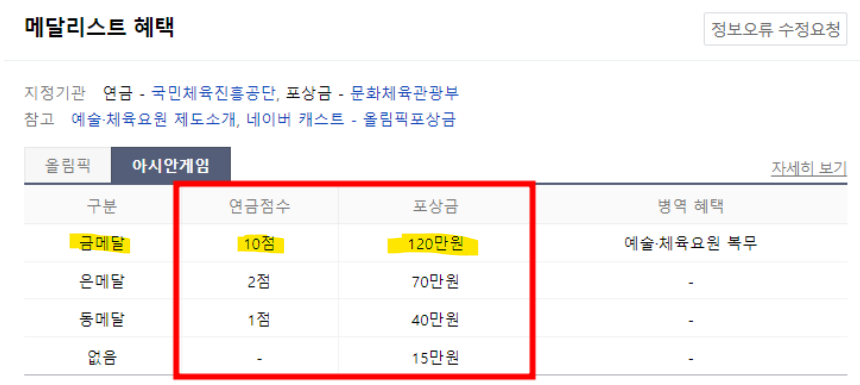1) 아시안게임의 메달리스트 혜택은 아래와 같습니다.