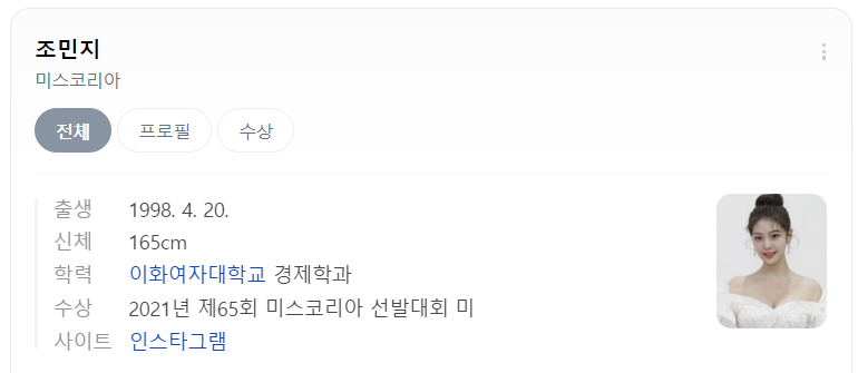 먼저, 가장 유명한 포털 사이트중 하나인 네이버에서 검색만 해도 조민지 그녀의 프로필이 나오기도 합니다.