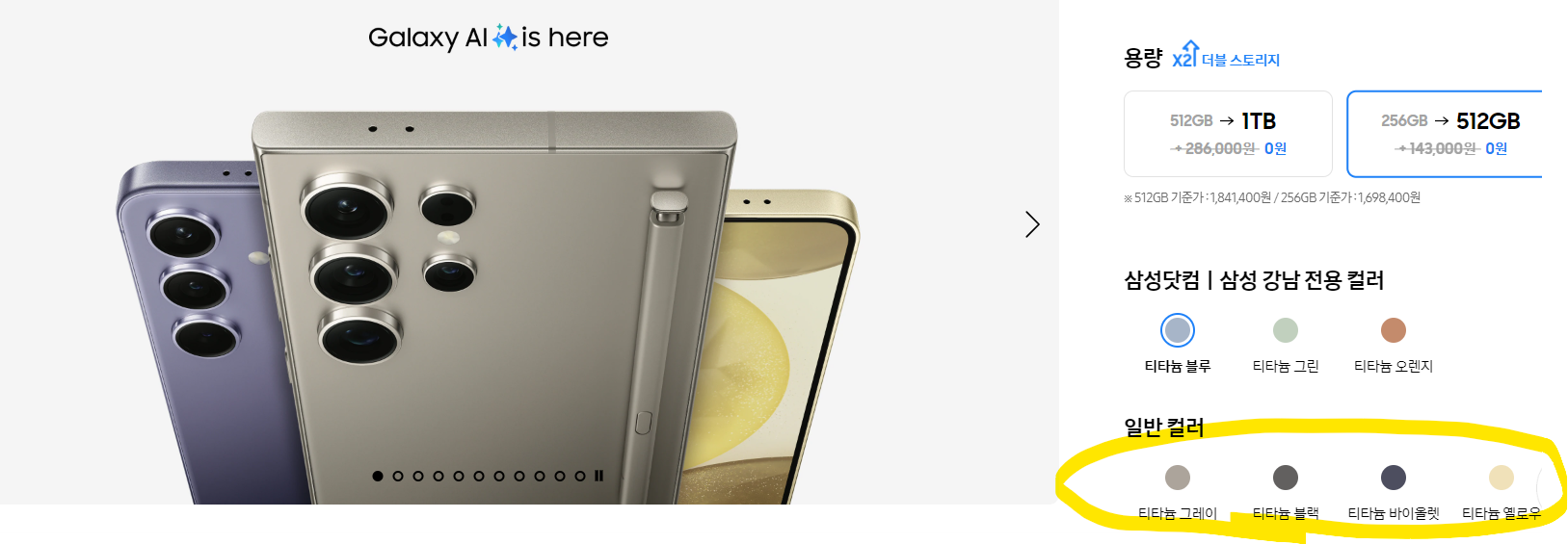 갤럭시S24 울트라: 티타늄 블랙, 티타늄 골드, 티타늄 바이올렛, 티타늄 옐로