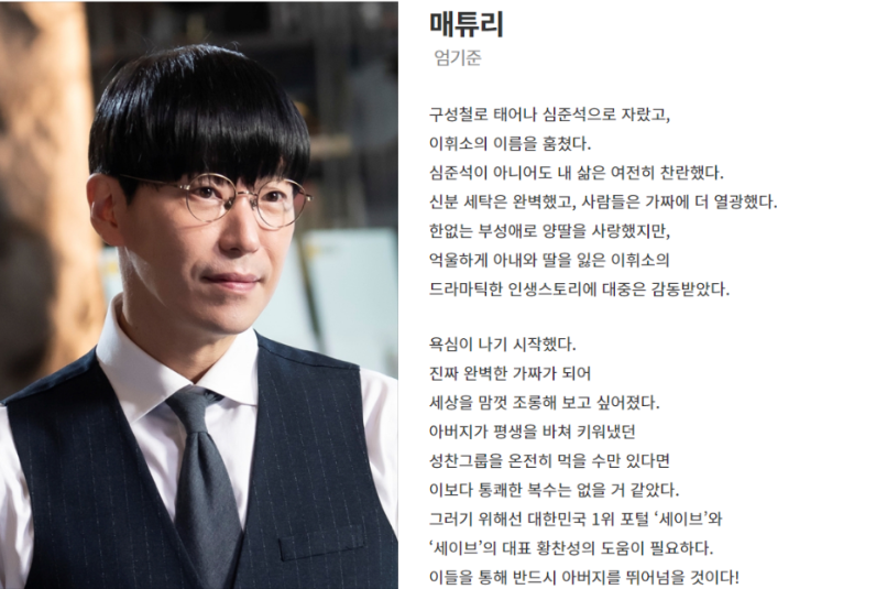 다음으로 매튜리 역의 엄기준 배우를 소개하고자 합니다. 이 인물은 전작에서 최종 빌런으로, 모든 사건의 배후 조종자였죠. 민도혁의 가족을 몰살시키고 방다미에게 누명을 씌우는 등 엄청난 소행을 벌였습니다. 게다가 자신이 방회장의 아들 심준석라는 사실도 드러났는데요. 부모의 사랑을 갈구하다 이렇게 타락한 것으로 추측됩니다. 이번 작품에서도 그는 여전히 권력을 좀스레 여기며, 살인까지 서슴지 않는 모습을 보일 것 같습니다. 그의 수하로 나오는 인물 중 하나가 양진모입니다.