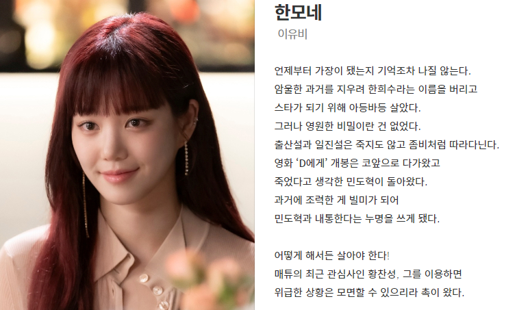 한모네 역의 이유비 배우도 주목해야 할 것 같습니다. 그녀는 단순한 악녀가 아닌 복합적 심리를 보여주었죠. 전작에서 딸 금라희와 갈등하며 독자적 행보를 걸었는데, 이번에는 민도혁과 가까워질 수도 있을 것 같네요. 상황에 따라 유동적으로 행동하는 스타일이었으니까요.