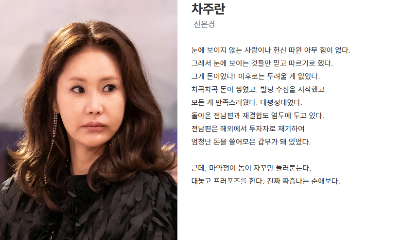 차주란 역의 신은경 배우도 빼놓을 수 없겠습니다. 이 인물은 돈에 환장한 나머지 자신의 본심을 잃고 타락한 케이스랍니다. 매튜리에게 충성했지만 언젠가는 배신할 가능성도 있어 보입니다. 오로지 금전적 이익만을 추구하는 성격이었으니까요.