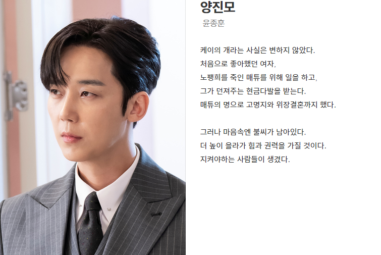 윤종훈 배우가 연기하는 이 캐릭터는 전작에서 팽희를 죽인 가해자였죠. 단순히 매튜리의 지시를 따랐을 뿐이지만, 그 소행이 너무나 잔혹했습니다. 하지만 이번에는 민도혁 편에 설 가능성도 있어 보입니다. 팽희에 대한 죄책감이 있을 터이고, 매튜리에 대한 반감도 있을 것 같아서입니다.