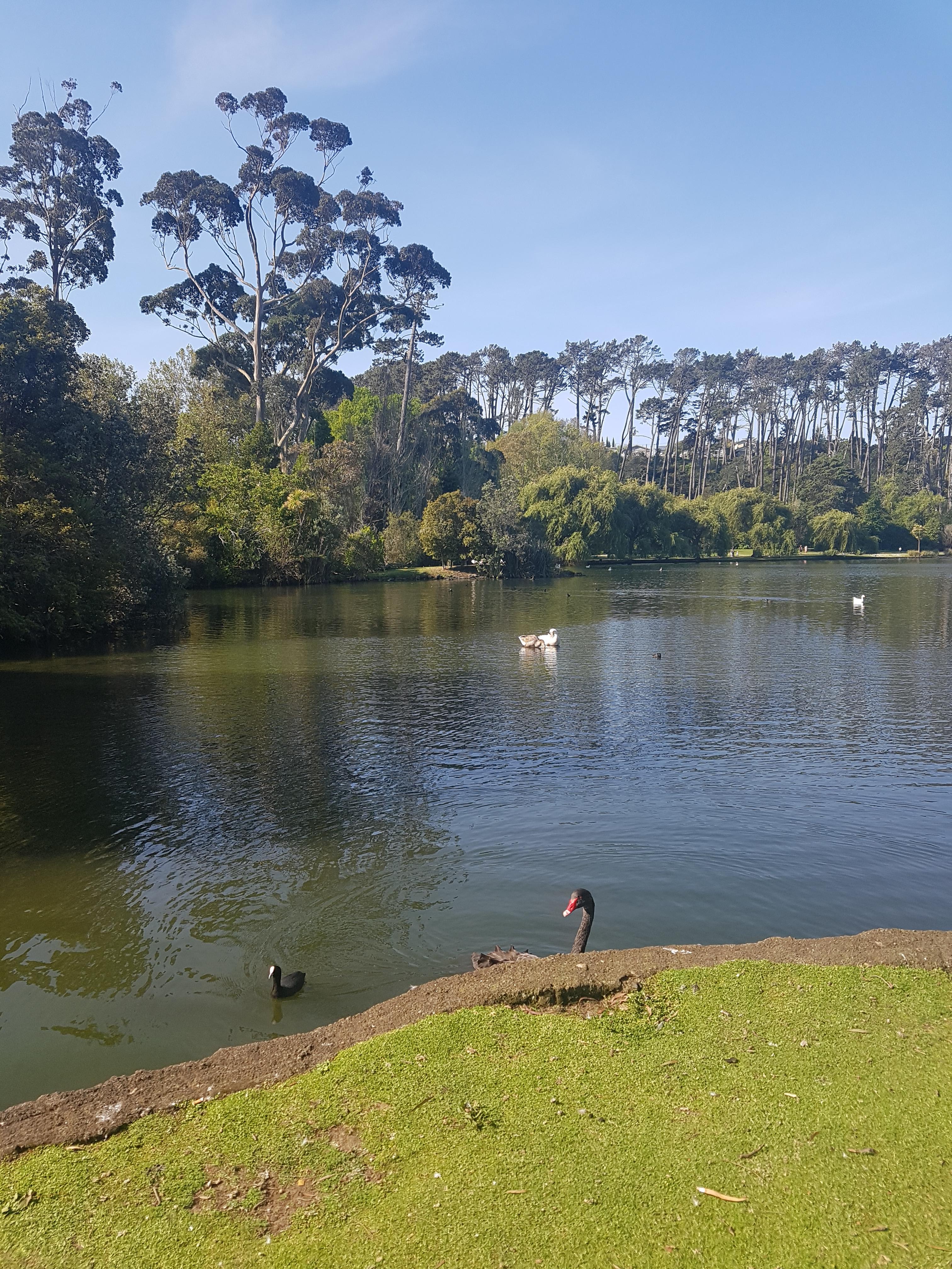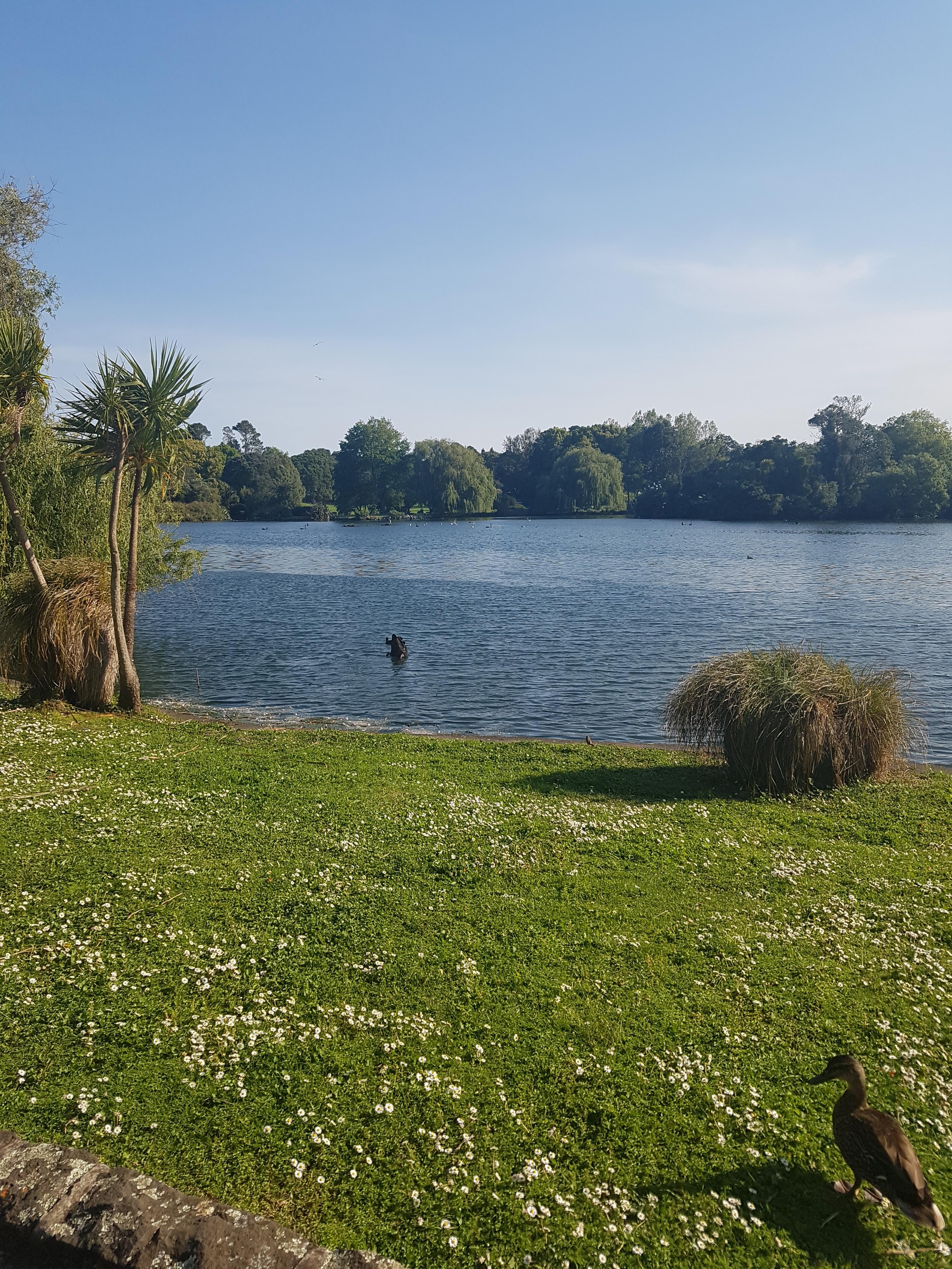오클랜드 CBD에서는 보기 힘든 푸케코pukeko(왼쪽아래의 파란색 목부분과 붉은 부리를 가진새)도, 여기 호수에서는 심심치 않게 볼 수 있다.
