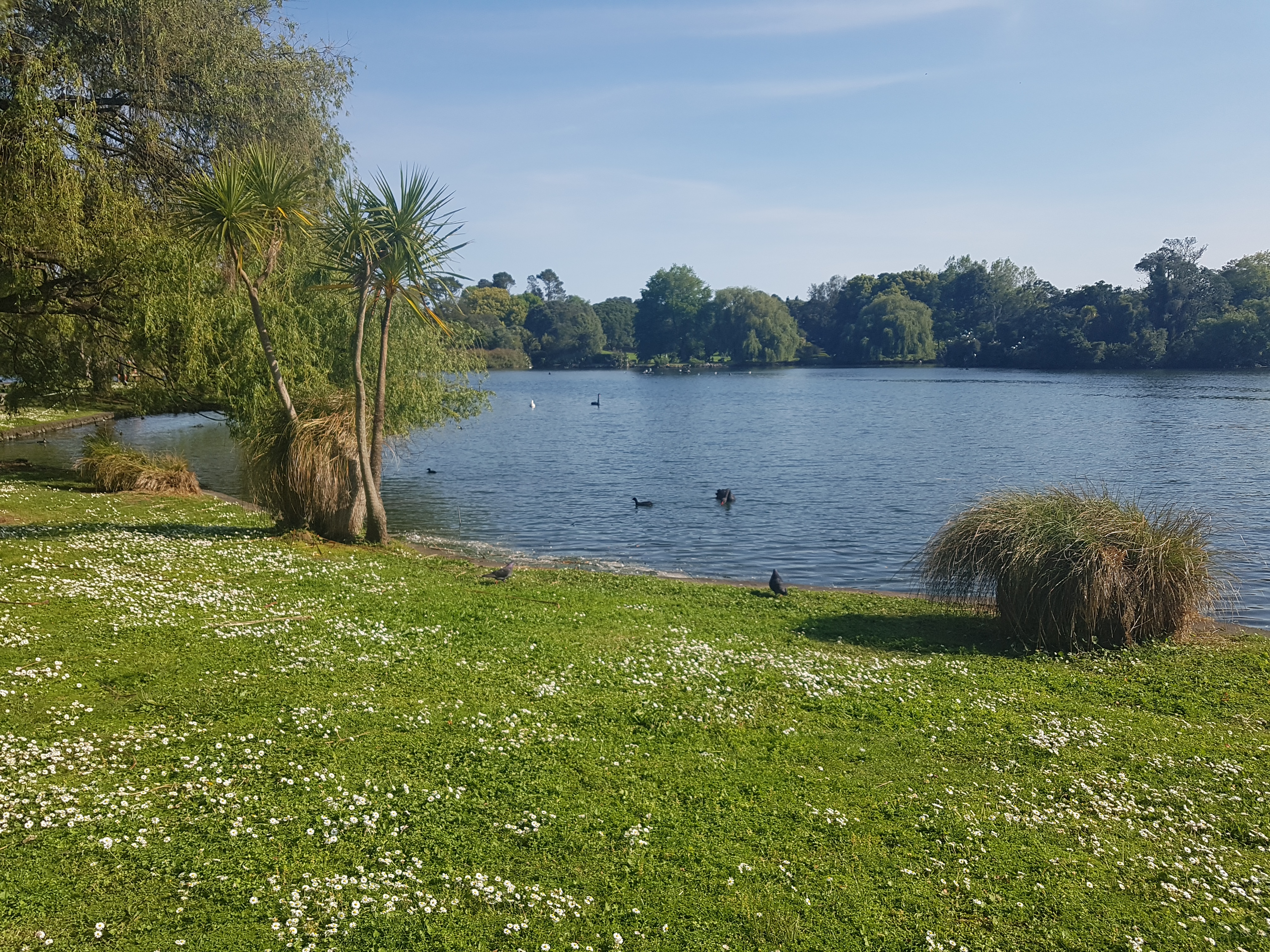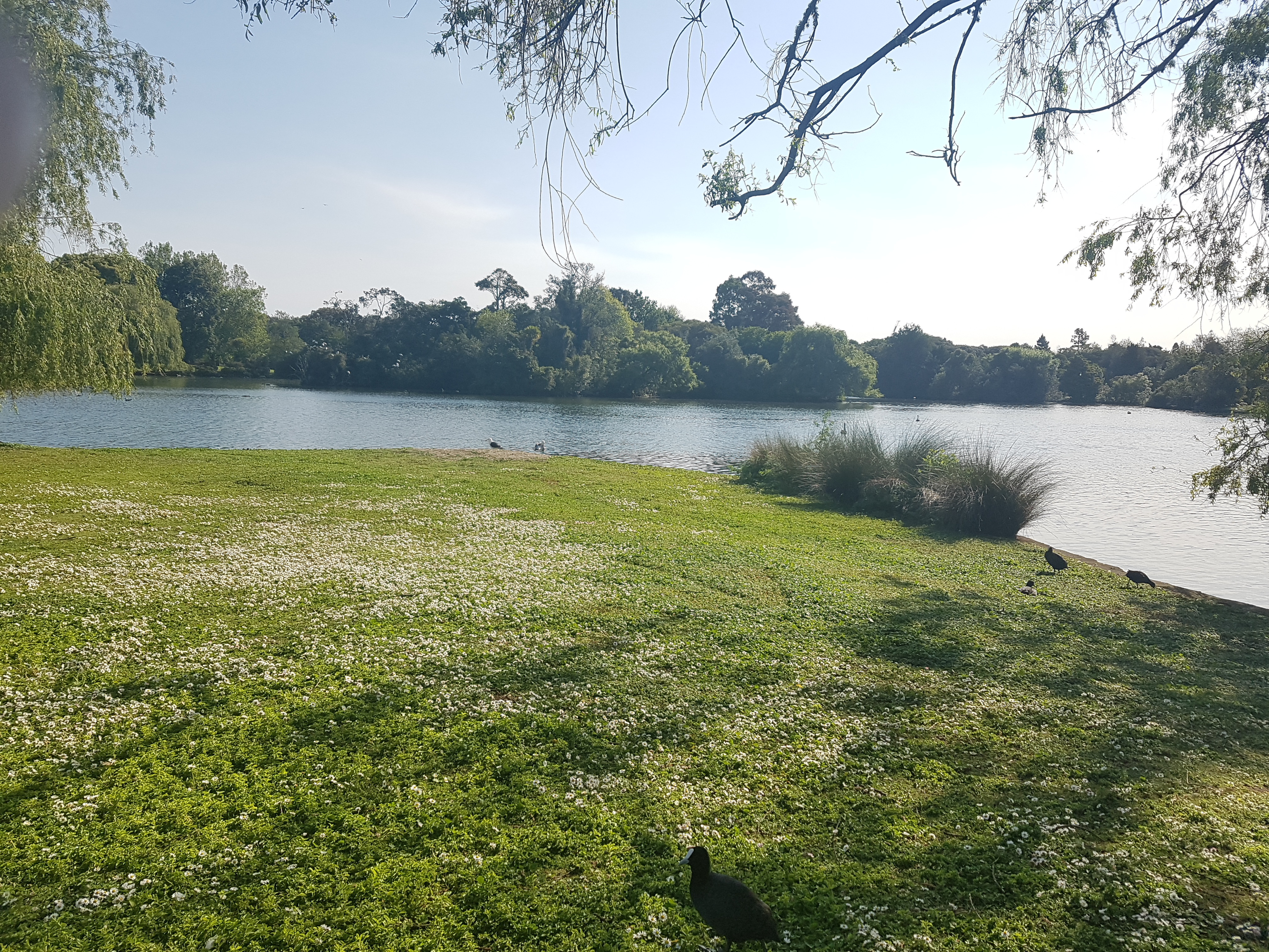 오클랜드 CBD에서는 보기 힘든 푸케코pukeko(왼쪽아래의 파란색 목부분과 붉은 부리를 가진새)도, 여기 호수에서는 심심치 않게 볼 수 있다.