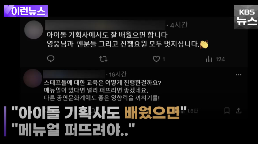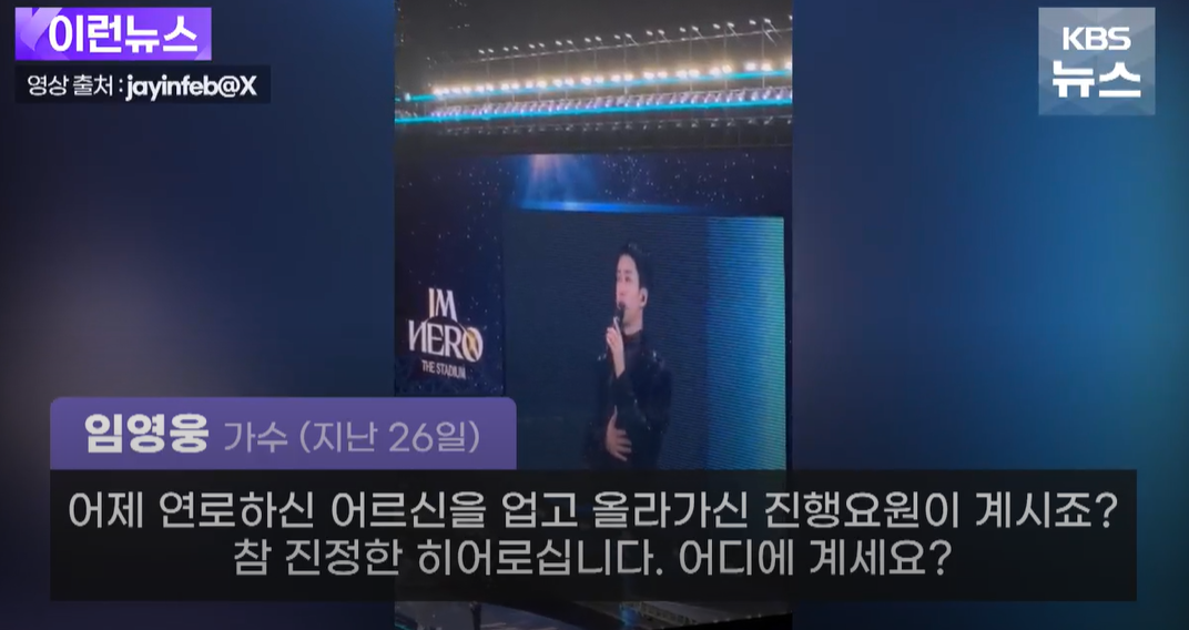 거동 불편하신 어르신을 보자마자 업고 자리까지 안내해 주시네요. 우리 진행요원 칭찬해요"라고 전했습니다. 이 소식은 임영웅에게도 전해졌고, 임영웅은 다음 날 콘서트에서 해당 진행요원을 화면에 비추며 "어제의 히어로"라고 소개했습니다. 임영웅은 "정말 멋진 일을 하셨습니다. 진행하시는 모든 분이 친절하게 해주셨습니다. 따뜻한 박수를 부탁드립니다"라고 말하며 감사의 마음을 전했습니다. 이에 팬들은 뜨거운 박수로 응답했습니다.