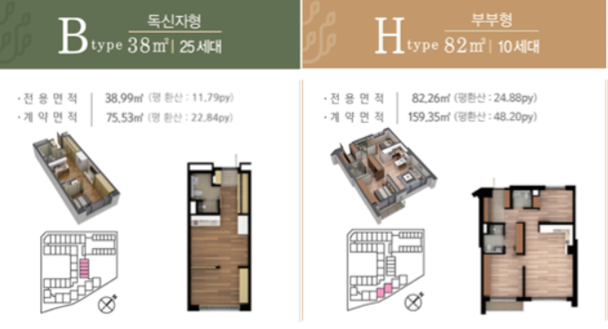 | B-타입 | 독립적인 생활을 꿈꾸는 시니어들을 위한 스튜디오(원룸) 타입 주거 공간 | 11.79 py | 25세대 |
